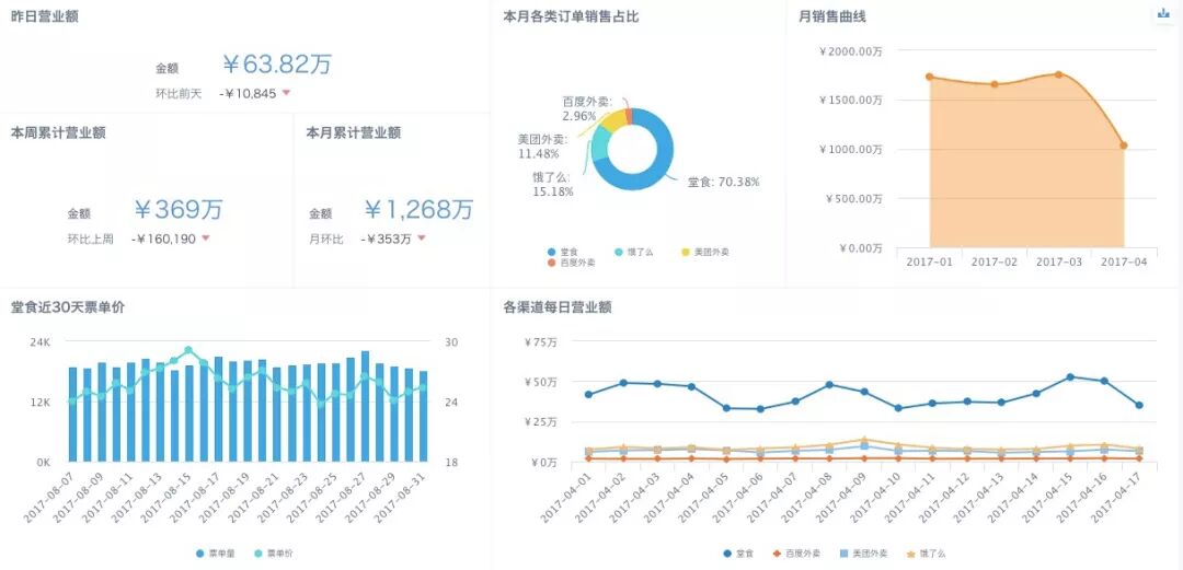 对于餐饮行业来说,及时调整总结很重要,而每天去盘点菜品的销售情况以及各渠道的销售额又是一件工作量很大的事,通过观远数据销售分析模型,抢鲜到营销运营团队可以随时获悉每个渠道的销售额、目标的完成率、店铺排名以及活动前后差异等数据,从而采取针对性措施去提升业绩。