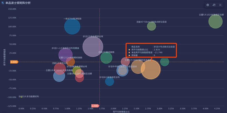 商品运营的一个重要分析场景是用ABC分析来做商品分析,而观远数据还有另外一种思路:波士顿矩阵分析。它的特点是在销售增长速度、销售额占比划分的四个象限内,更好的展示不同商品的指标量级与差异;同时每个商品关联“商品销售情况明细”来查看其销售构成,便于其洞察畅滞销的具体原因。