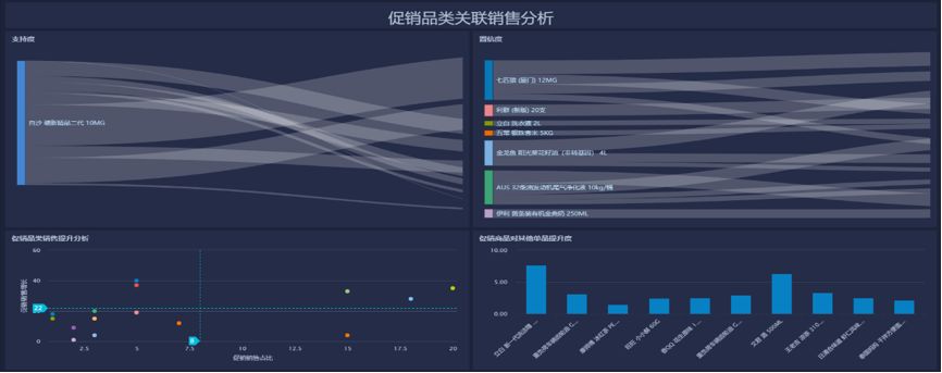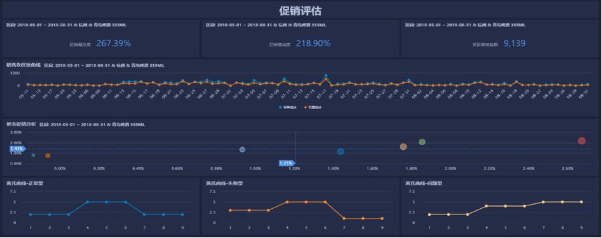 针对这一问题,观远数据在和众多零售企业合作的过程中沉淀出了成熟的营销分析模型,通过整合销售、财务、会员消费等数据。可以精准的指出活动各项指标是否达成,财务成本是否超支,活动期间降价折扣用于引流的商品是否对整体销售业绩起到了拉升作用,对应哪些品牌或者供应商商品提升更显著。可以通过参活率(100笔小票,有多少笔小票参加了本次活动)这一指标反应出顾客对于本次活动的接受程度如何。并且可以结合重点推荐品类,促销前的销售占比,促销时的销售占比和促销结束一到两周后的销售占比的前后对比分析(黄氏曲线),来直观给出本次营销活动是否成功,本次营销活动是否给重点推荐品类带来新的客户群体,还是只是在原有的客户群体上进行了消耗。