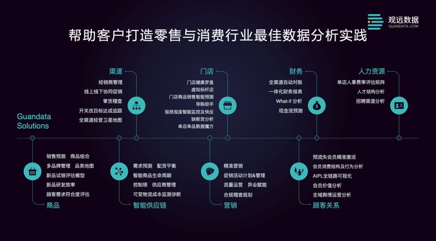 以“AI+BI,让决策更智能”为使命,观远数据赋能商品、门店、供应链、营销、渠道、顾客等全业务链条与管理领域。从数据接入与融合、指标体系梳理、分析场景规划、产品工具应用等数据分析应用全流程,给客户提供数字驱动运营的一体化落地方案,旨在帮助客户打造零售与消费者行业成熟数据分析实践。