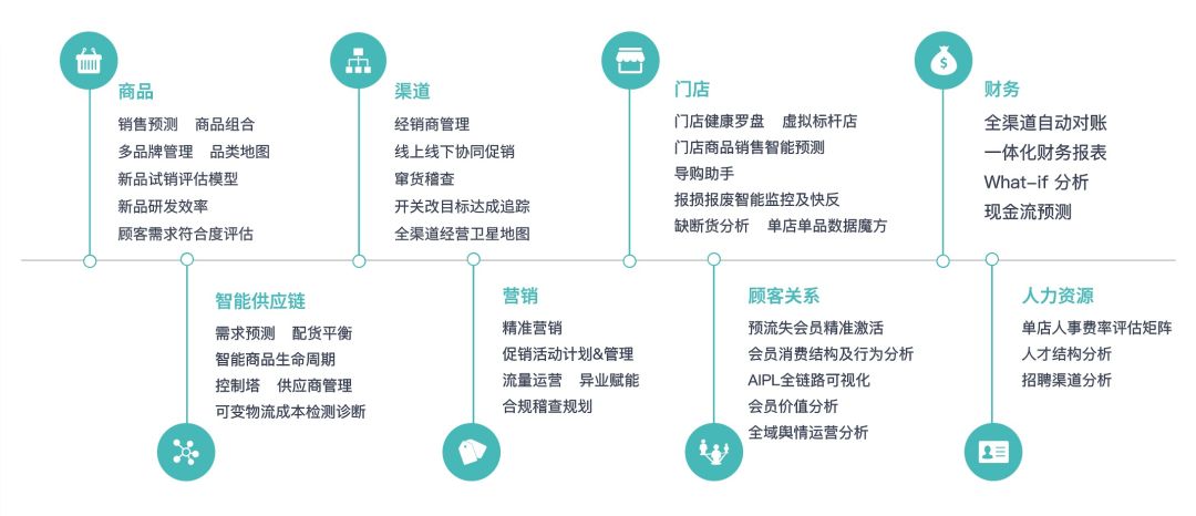 除了疫情期间企业重点关注的分析场景,回归到零售企业的日常运营分析中,观远数据还总结了包含商品、渠道、供应链、门店、营销、顾客关系、财务、人力资源等在内的八大高频使用的数据分析场景。