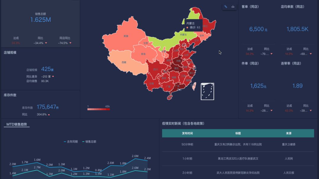 以全渠道的运营监控为例,企业可以通过数据大屏或者移动端决策驾驶舱,从全国视角去看整个大盘的销售业绩与各区域疫情情况之间有怎么样的关系。并且,还可以下钻到不同区域不同门店,对于疫情期间营业额重点贡献的门店给予供应链和营销资源上的充分支持。