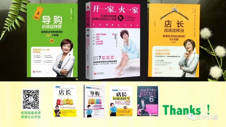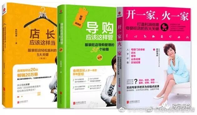 欧阳海淼:资深门店管理专家。《前沿讲座》电视栏目专家讲师,《服装时报》《中国美妆》《母婴商情》《店长》《鞋世界》等媒体特约专栏撰稿人。