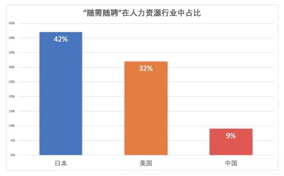 根据CIETT调查报告,从中国与国际上发达国家用人模式对比中可以得出:日本的“随需随聘”雇佣模式已经十分成熟,“随需随聘”在人力资源行业中占比已到42%,美国紧随其后,占比32%。而中国的“随需随聘”的构成仅占到人力资源行业的9%,与日本和美国相比差距较大。因此,这类用人模式在发达国家十分成熟,广泛应用于各行各业,而在中国反而知者甚少。