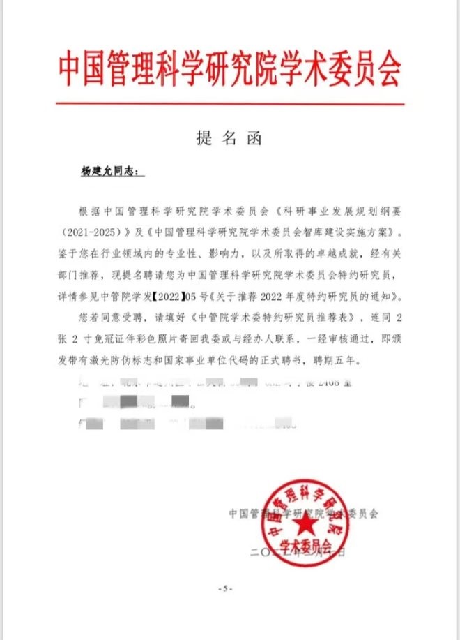 2022年2月被提名聘请为中国管理科学研究院学术委员会特约研究员;