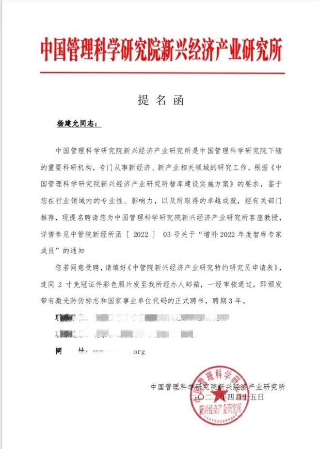 2022年4月被提名聘请为中国管理科学研究院新兴经济产业研究所客座教授、智库专家。