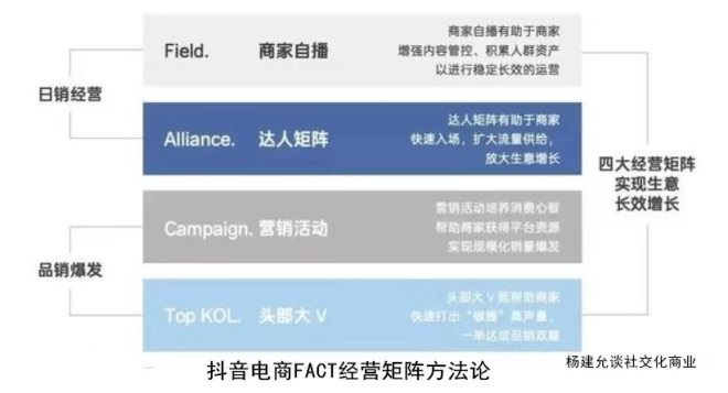 4. D音电商内容场FACT模型(Field商家自播-Alliance达人矩阵-Campaign营销活动-TopKOL头部大V)升级为中心场(D音商场+搜索)和营销场和之前的内容场一起协同,为商家拓展阵地。其中内容场是D音电商基本盘,中心场延伸转化场域,提升转化效率,营销场是付费流量和自然流量协同经营,拓展流量开口。
