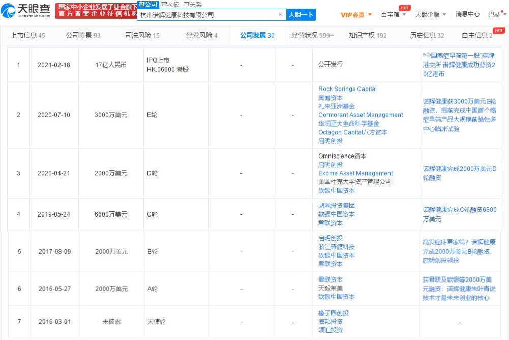 诺辉健康在癌症早筛领域的布局仍在进行,多家知名投资机构也在观望其后续表现。