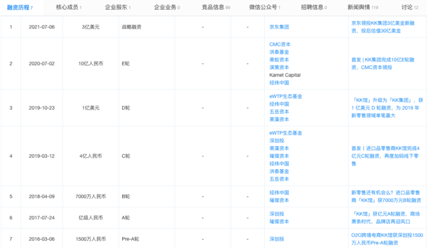 天眼查数据显示,2016年以来,KK集团一共完成了7轮共计超40亿元的融资,获得了包括CMC资本、京东、深创投、经纬创投、洪泰基金等众多明星VC的支持。
