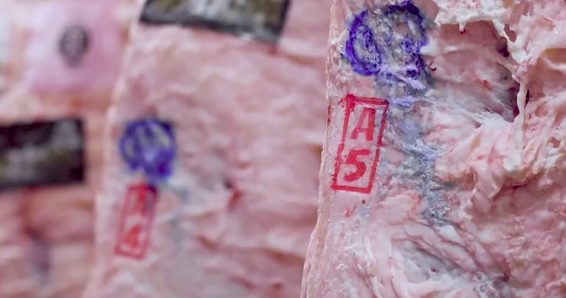 30个月过去,高质量牛牛养成。2位拿着打分板的评级专员入场,他们需要对着小黑赤裸裸的“尸体”进行评级。只有达到A4,A5以上的才有资格使用“和牛”的标示,小黑很荣幸,被敲上了A5的标签。当时评级的场景,让曾经给小黑做马杀鸡的美好光景瞬间破灭。