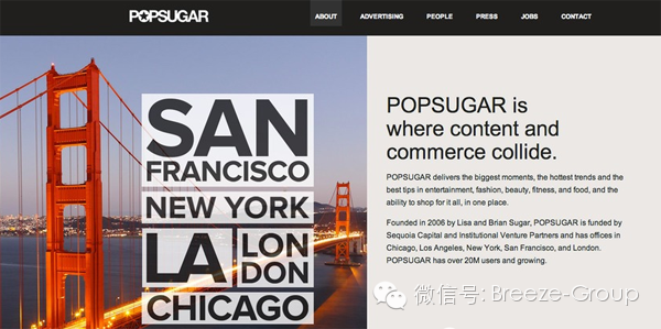 Popsugar的服务内容涵盖的都是人们感兴趣的,娱乐,名人,时装,美容,健身,食品,以及育儿等等,而且以多种形式提供服务,包括线上,App应用,电视等等。 2007年,该公司收购了购物搜索引擎公司ShopStyle,同时,他们与Birchbox公司合作,推出了Popsugar Must Have,它是一个由Popsugar编辑推荐的订购时尚包。Popsugar现在已经成为了一个全球生活方式品牌,网站每月有4100万独立访问量,以及2.34亿页面访问量。