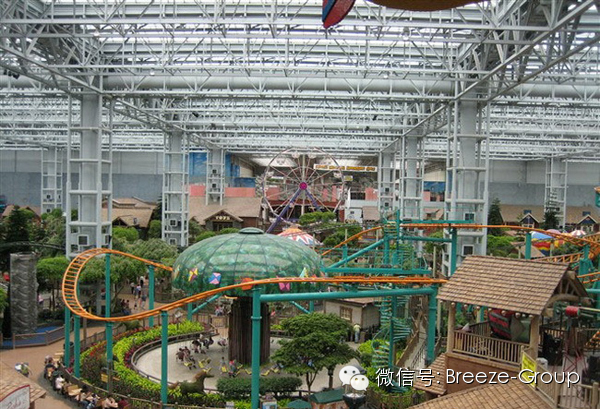 美国第二购物娱乐中心MallofAmerica,这个项目的使用率大概在58%,印证了我之前所说。他拿出很大的中间地段的面积来建设一个超大型游乐场“NickelodeonUni-verse”,投资7000万美元,里面的项目是另外收费的,给钱可以玩,不给钱也可以看看。再看它的四个角,就有四间不同的百货。百货是里面的主力店,四间百货大家都卖服装,每个百货都与不同的设计师签约,大家卖的都是不同设计师和款式的服装。北京的老佛爷百货也是,与其他商场的品牌可能一样,但他有的商品,别人肯定没有,款式不一样,它把某些品牌的某些款式买断了,只能在这里买到,做了小众安排,不一定买断所有款式,买断几个系列就足够了。