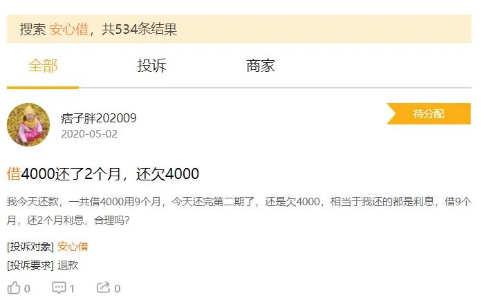 其中有位网友“Ailie202003”3月19日发起投诉称2019年7月25日,其在安心借平台借款10000元,但平台在分期中变相收取很多费用,这个是不符合国家法律规定的,费用分为12期,每期还款1133.30总还款13599.6,利息高达3599.6元。找专业的精算师算过,安心借此笔贷款的年化利率是60.95%,远远超过国家规定利息,已经侵犯了本人的合法权益。