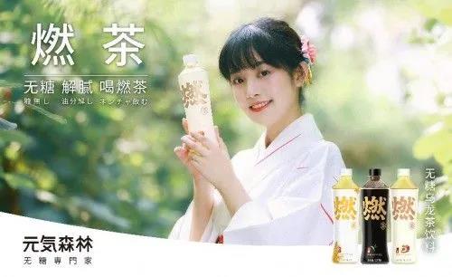 从元气森林的气泡水颜值来看,确实日系。气泡水颜色鲜艳,包装上印着“気”字,日文字样容易让消费者联想为“日系品牌”。除了包装,在宣传上也极具“日系风格”,选择甜美长相的日系女模特,整个广告版面也比较简洁,文字都是中文和日文同时出现。