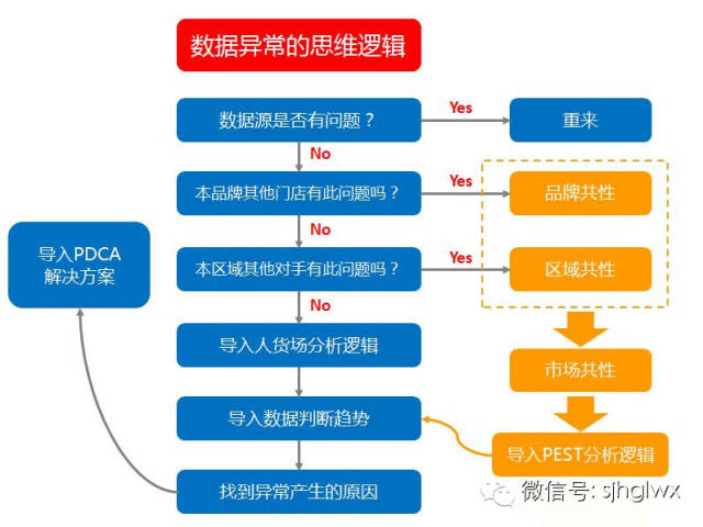 这是一张图,当我们发现店铺或者区域数据出现异常的时候,应该有怎样一种思维逻辑、思维方式。当我们发现店铺的数据出现异常,例如成交率下降以后,很多人的思维就是直接去找背后的原因,而不是先去梳理数据和逻辑,这样反而不容易找到背后的原因。所以我们去做零售思维的时候,一定要有逻辑。