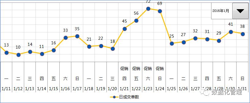 所以提前想到用户的需求是非常重要的一种业务洞悉。而这就图的做法也很简单,把日期、星期和促销的文字同时作为横坐标添加到曲线图中就ok,而星期几可以直接用weekday函数自动生成。