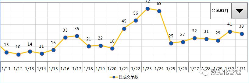 下图是一张零售店铺日成交单数的曲线图,看这张图用户会第一时间注意到21曰-24日这 几天的销售单数比较异常。受众顺其自然就会想什么问题?什么原因?
