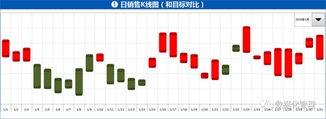 下图是一张店铺日销售目标完成追踪图,借鉴了股票市场的K线图形态。K线图大家都懂的,所以容易共鸣。
