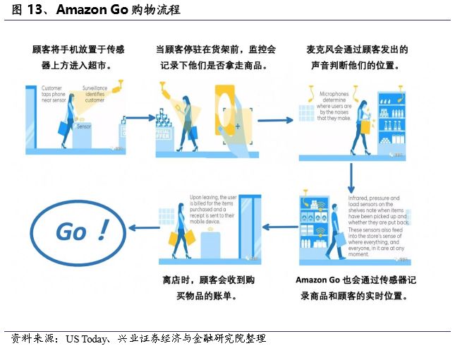 早在2014年,美国最大的电子商务公司亚马逊就开启了从线上到线下的布局,开设了第一家实体零售店。2016年末,亚马逊宣布推出线下实体商店Amazon Go,并在2018年初投入使用。使用Amazon Go十分方便快捷,在此购物的顾客可以享受到“不排队、不结账“的新型购物体验。顾客只要携带拥有亚马逊应用的手机走进商店,拿上自己想要的商品,便可以略过结账过程直接离开超市,账单便会在顾客离开超市后从亚马逊账户扣费,完成整个购物流程。这项流程主要运用了机器视觉、深度学习算法和传感器融合技术。亚马逊公司还指出,预计在2021年前,将在全球开设3000家门店。亚马逊对于新零售的布局不止于此,2017年6月,亚马逊以137亿美元收购美国高端食品超市Whole Foods(全食超市),进一步扩大新零售布局。