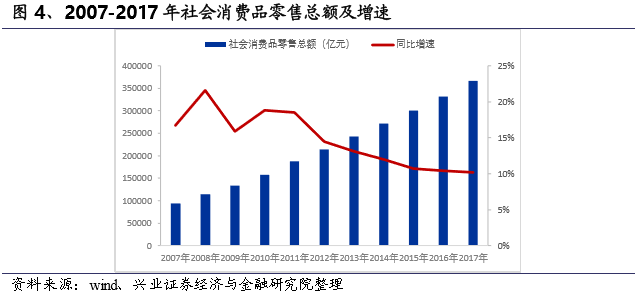 零售行业增速趋缓,规模依然可观。在过去20年间,随着我国国民可支配收入和人口的不断增加,零售市场的消费总额也持续提升,市场规模不断扩大。2017年,我国的零售市场消费总额已达36.62万亿元,逼近美国57564美元的消费总额。自2008年以来,我国消费品增速基本保持在10%以上,同比增速在2008年达到顶峰21.6%。近些年来增速逐渐下降有所放缓,但零售消费规模依然十分可观。