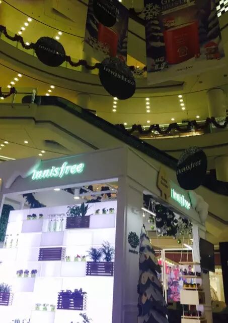 (吊旗、电梯,都染上了品牌烙印,宏伊广场不仅将门面给了innisfree,内场的配合最终营造了真正的“品牌日”效果)