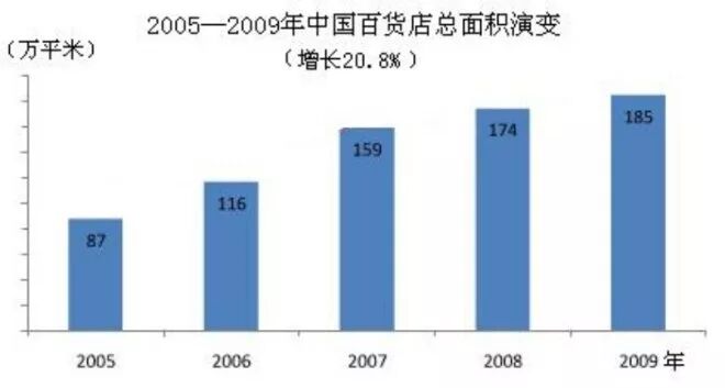 从发展规模看,一方面,单店数量增加明显,从2005年的3947个,增加到2009年的7330个,增长16.7%,见图表所示。另一方面,百货店的总面积增长迅速,从2005年的87万平方米快速增长到2009年的185万平方米,如图所示。见证了行业内的共同认知:百货店靠规模效益取胜。同时也说明百货店在这个时期迎来了井喷式扩张和发展。