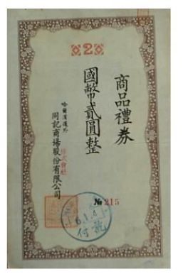 现在的哈尔滨,不少人知道秋林百货,其实还有一家始创于1907年的百货店,叫同记商场。创始人武百祥,楹联写的是:“采办环球货物,搜罗国内产品”,规定“货真、价平、优待、快感”四条店规,亮出“明码实价、童叟无欺”的牌子,明码标价,并写出店铺运营规则。引用商品礼券(见附图)促销。