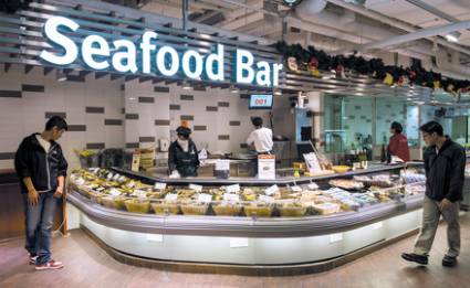 超市将自助餐厅引进超市内区,聘请厨师现场为顾客烹饪食物。顾客购买的食物,不用走出超市,现场就有厨师为您现场烹制,您只需在就餐座椅区随时享用美食。