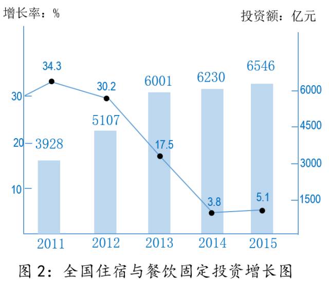 ● 增长动力:效率提升取代数量扩张 近年来,受到原材料、房租、人工、能源成本上升影响,餐饮企业的盈利能力逐渐下降,据统计,“十一五”期间,餐饮业百强的平均净利润率为11.7%,“十二五”期间仅为6.1%,下滑近半。盈利能力的持续下滑导致餐饮业投资增长率也逐步下跌,据统计,全国住宿和餐饮固定资产投资额的增长率从2006-2012年的30%以上,下降到2013年的17.5%,2014年仅为3.8%,2015年为5.1%,下跌明显。如图2所示。